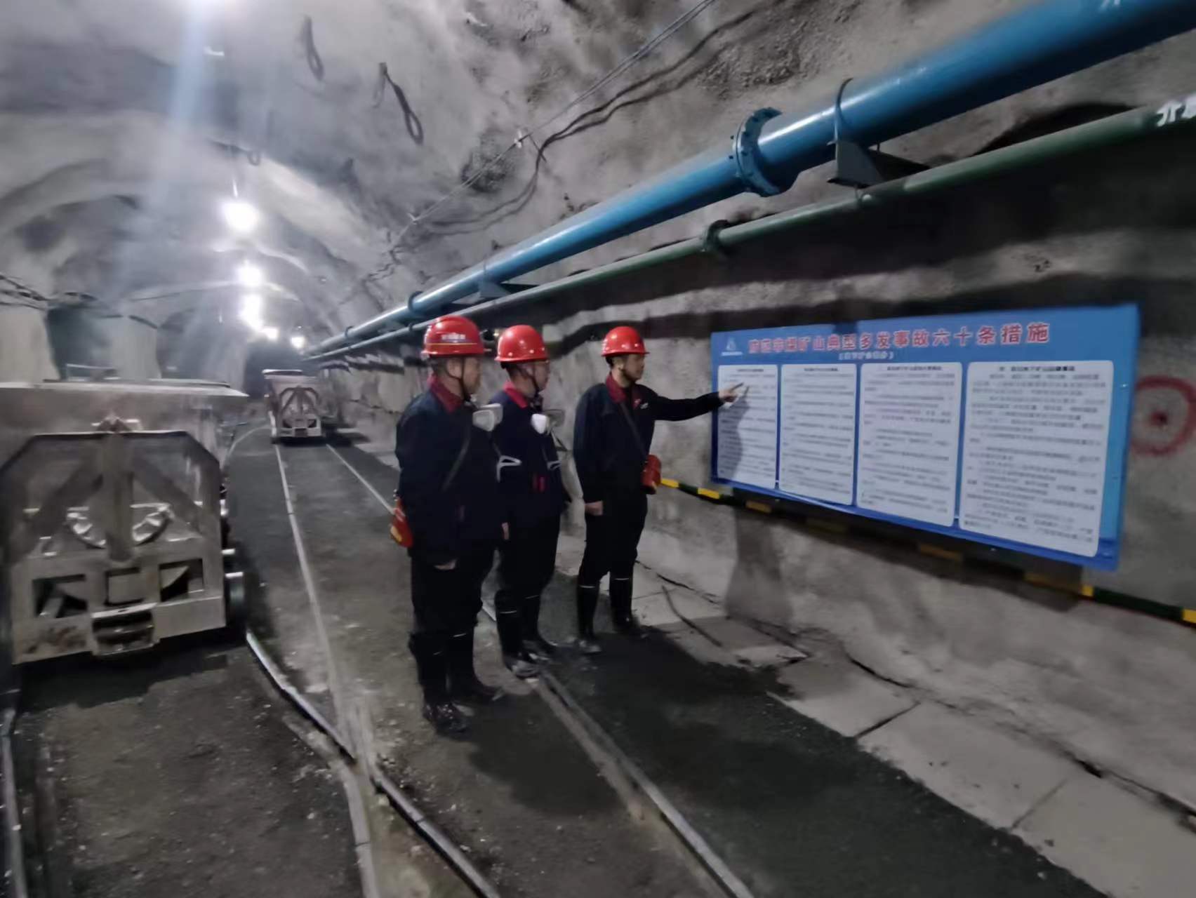 汪冬生一行深入付老莊鐵礦井下-440m主巷,檢查了有軌運輸系統、溜礦井、避災硐室等地點并沿著新開通的斜坡道,步行進入-560米水平,沿途查看二期開拓工程質量和施工進度情況;聽取了富凱公司負責人針對礦山安全生產制度措施落實情況、安全防范工作部署落實情況、風險隱患排查整治及管控措施落實、教育培訓和應急演練等情況匯報。
